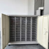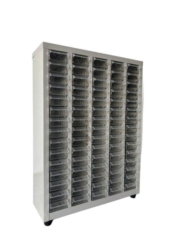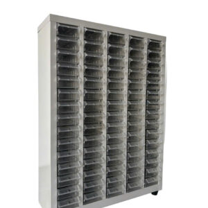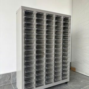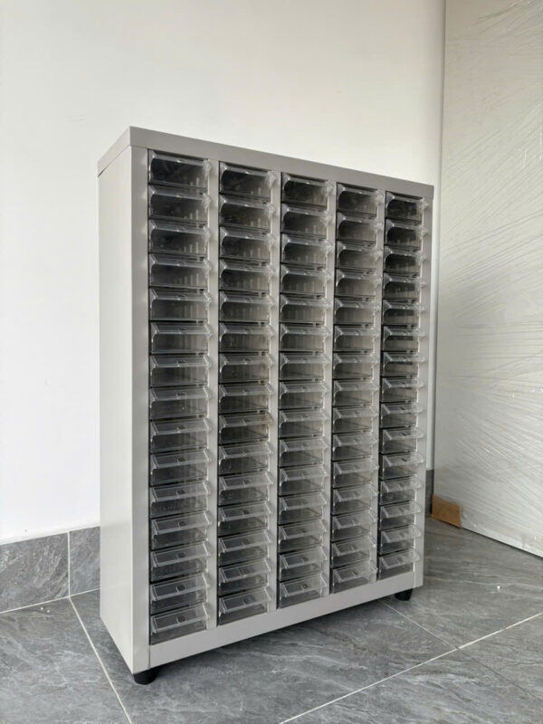 Tủ đựng linh kiện 75 khay nhựa không cửa có 2 cánh sắt mở dùng chung 1 khóa, bên trong có 75 hộc trượt ra vào bằng nhựa.